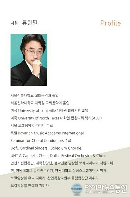 류한필 대전교회음악아카데미 대표의 프로필.(사진제공=대전교회아카데미) 대전교회음악아카데미(대표 류한필)는 교회음악에서 필요한 지휘법, 리허설테크닉, 합창발성법, 찬송가학 등을 10주 과정으로 양성하는 ‘제2기 교회음악지도자 과정&rsquo... 2015-11-30