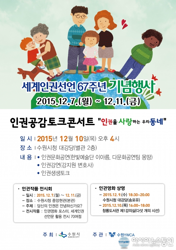 수원시, 세계인권선언 67주년 기념 행사 포스터.(사진제공=수원시청) 수원시는 세계인권선언 67주년 기념일을 맞아 인권공감 토크콘서트 등 다양한 행사를 개최한다. 세계인권선언은 2차 세계대전으로 인해 전 세계에 만연했던 인권침해 사태에 대한 ... 2015-11-26