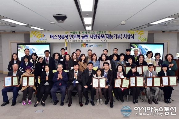 25일 오후 수원시청 중회의실에서 '2015년 하반기 버스정류장 인문학 글판 창작 詩' 공모 입상자와 재능기부자에 대한 시상식이 열렸다.(사진제공=수원시청) 수원시는 지난 25일 시청 중회의실에서 '2015년 하반기 버스정류장 인문학 글판 창작... 2015-11-26