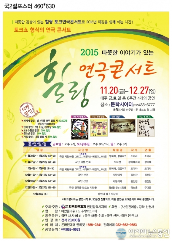 26일 인천연극협회가 인천 지역 4개 극단과 함께 새로운 공연 문화를 시민들에게 제공하고자 공연을 준비하고 있다고 밝혔다. 사진은 공연 포스터.(사진제공=인천연극협회) 인천연극협회가 인천 지역 4개 극단과 함께 새로운 공연 문화를 시민들에게 제... 2015-11-26