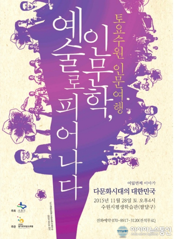 토요수원 인문여행, 다문화 이해의 장 마련 포스터.(사진제공=수원시청) 공연예술과 인문학 강좌를 같이 즐길 수 있는 '2015 토요수원 인문여행-인문학, 예술로 피어나다'의 여덟 번째 강연이 오는 28일 토요일 오후 4시부터 수원시평생학습관 강... 2015-11-23