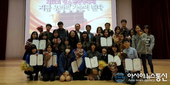 21일 경남 창원시 마산종합운동장 내 올림픽 기념관 공연장에서 열린 제12회 청소년 영상축제 ‘지금 우리의 가슴이 뛴다’ 시사회와 시상식에서 수상자들의 기념촬영 모습.(사진제공=창원시청) 경남 창원시 마산종합운동장 내 올림픽 기념관 공... 2015-11-22