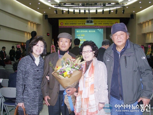 종합문예잡지 '문학세계'가 수여하는 '세계문학상' 시상식이 열린 21일 시조부문 본상을 수상한 민병덕 시인이 상주문협 회원인 정복태 소설가와 조재학 시인(맨 왼쪽)의 축하를 받고 부인과 함께 포즈를 취하고 있다.(사진제공=소설가 정복태) ... 2015-11-22