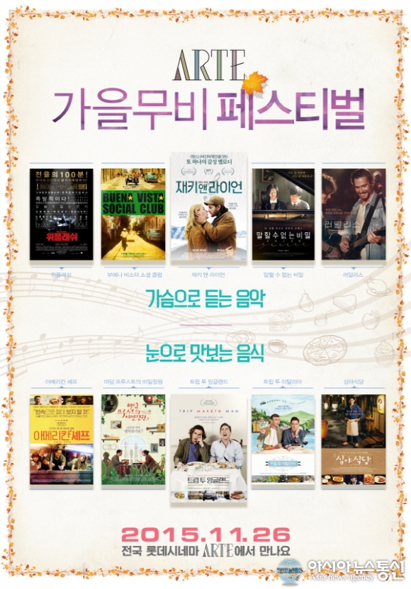 롯데시네마 '가을무비페스티벌' 포스터. (사진제공=롯데시네마) 롯데시네마가 오는 26일(목)부터 12월 2일(수)까지 일주일 간 음악, 음식이 함께하는 ‘가을 무비 페스티벌’을 개최한다. 이번 ‘가을 무비 페스티벌’은 음악과 음... 2015-11-16