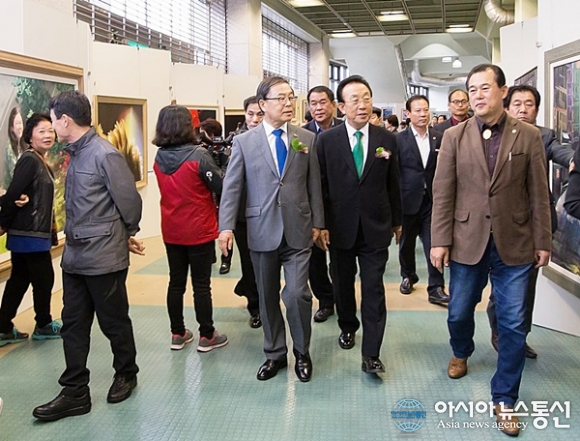 14일 경북 구미 박정희체육관에서 열린 '제16회 대한민국정수대전 시상식'에 참가한 김관용 도지사와 남유진 구미시장이 전시된 수상작들을 둘러보고 있다. 이 대전은 지난 2000년 제1회를 시작으로 매년 10월에 미술대전, 서예.문인화대전, 사진대전 등 3개 대전으... 2015-11-15