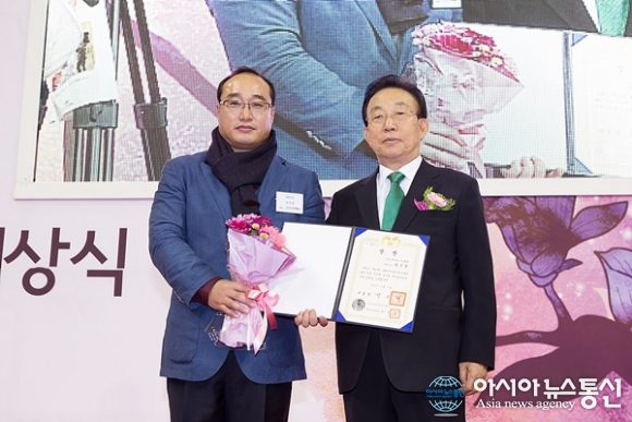 14일 경북 구미 박정희체육관에서 열린 '제16회 대한민국정수대전 시상식'에서 김관용 도지사가 대통령상을 수상한 라익권씨(사진부문)에게 대통령 표창을 전수하고 기념사진을 찍고 있다. 이날 도지사상은 미술부문 '삶.도심'을 출품한 김희정씨(51.광주)... 2015-11-15