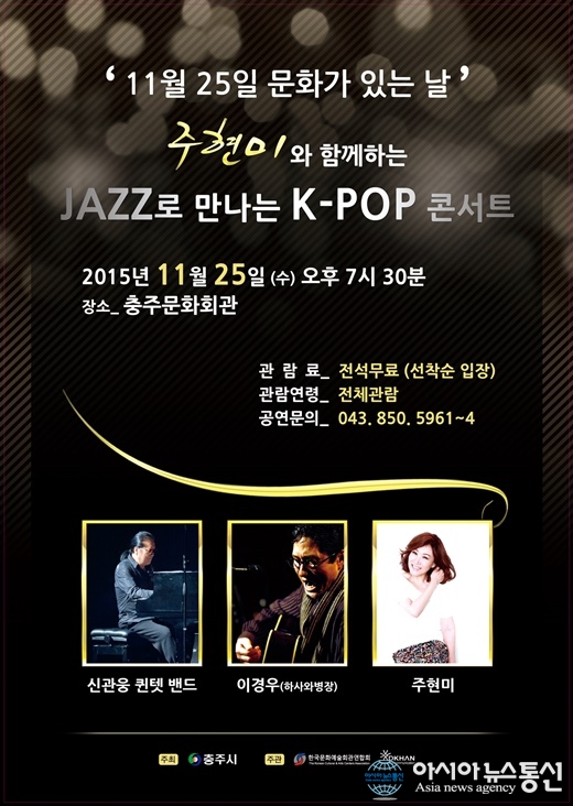 오는 25일 충북 충주문화회관에서 열리는 ‘재즈로 만나는 K-POP 콘서트’ 포스터.(사진제공=충주시청) 충북 충주시가 오는 25일 문화가 있는 날에 충주문화회관에서 재즈로 만나는 K-POP 콘서트를 개최한다. 충주시가 주최하고 한국문화예술회관... 2015-11-16