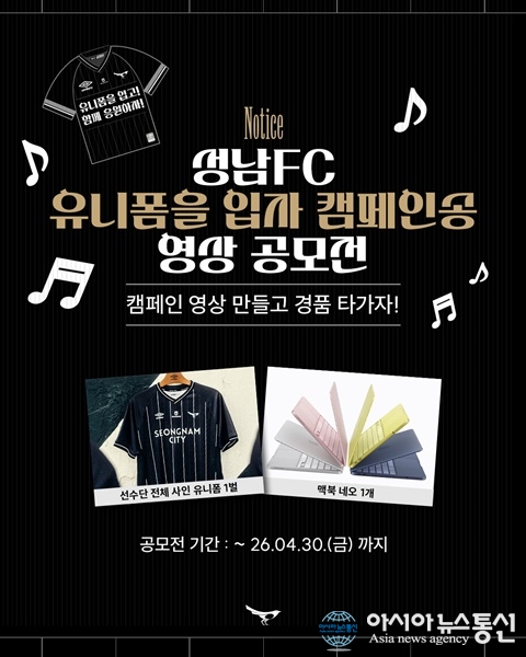 (사진제공=성남FC) [아시아뉴스통신=이상진 기자] 성남FC가 팬들의 반짝이는 아이디어로 구단의 캠페인을 알리는 ‘유니폼을 입자 캠페인송 영상 공모전’을 개최한다. 이번 공모전은 성남FC 팬이라면 누구나 참여할 수 있으며, 구단의 브랜드 가치를 높이고 유니폼 착용 문화를 확... 2026-04-09