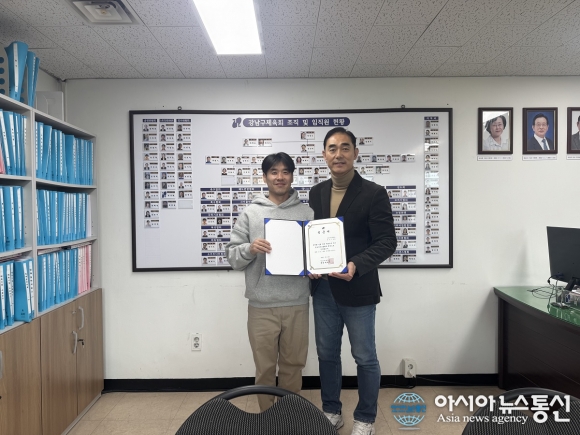 국립경국대학교 조윤환 박사과정생(왼쪽)이 강남구 피클볼 협회 인준을 받고 기념사진을 찍고 있다.(사진제공=국립경국대학교) [아시아뉴스통신=윤석원 기자] 국립경국대학교(총장 정태주) 일반대학원 체육학과 재학 중인 조윤환 박사과정생이 최근 '서울 강남구 피클볼협회'를 창립... 2026-04-09