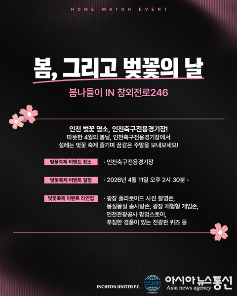 (사진제공=인천 유나이티드 FC) [아시아뉴스통신=이상진 기자] 인천유나이티드(대표이사 조건도)가 오는 4월 11일 오후 4시 30분 인천축구전용경기장에서 열리는 K리그1 7라운드 울산 HD FC와의 홈경기를 ‘4월 봄나들이의 날’ 두 번째 테마인 ‘봄, 그리고 벚꽃의 날’로 개최한다... 2026-04-08