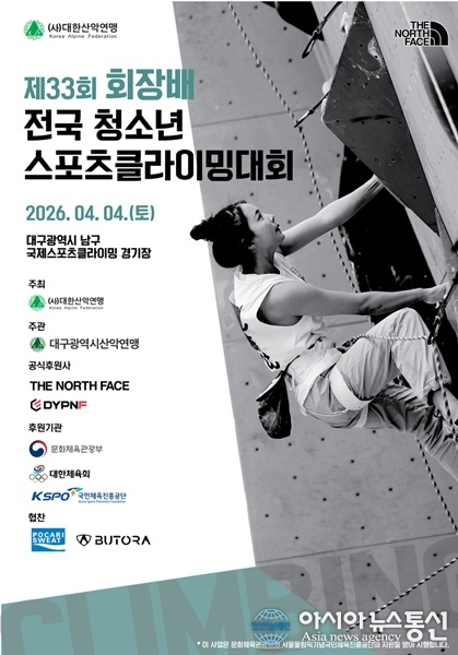 (사진제공=대한산악연맹) [아시아뉴스통신=이상진 기자] 사단법인 대한산악연맹(회장 조좌진)은 오는 2026년 4월 4일 대구광역시 남구 국제클라이밍센터에서 '제33회 회장배 전국 청소년 스포츠클라이밍대회'를 개최한다고 밝혔다. 이번 대회는 대한산악연맹이 주최하고, 대구광역... 2026-04-03