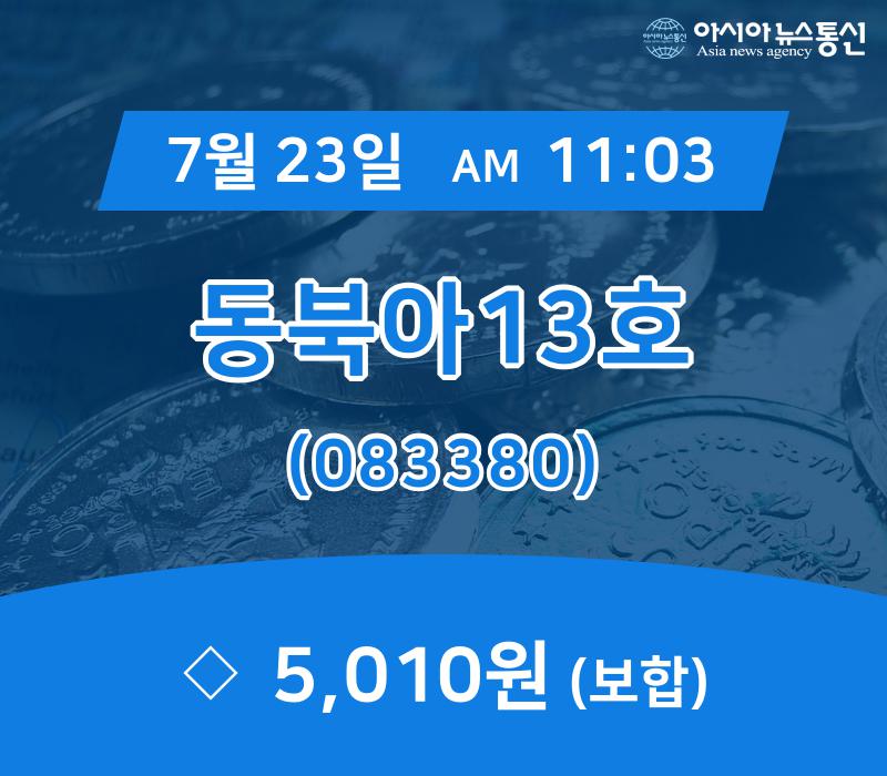 ▲7월 23일 동북아13호 의 주가정보 ◈동북아13호의 거래수량 변화 [현시간] 동북아13호가(083380) 거래량 추이 동북아13호의 시가총액 규모는 79억원, 상장주식수는 1,586천주다. 동북아13호의 등락률은 전일에는 0.00%의 등락률을 보였으나 오늘은 0.00% 변화한 5,010원을 보이고 있다. 동북아13호의 올해 250 최고가는 5,140원이... 2019-07-23
