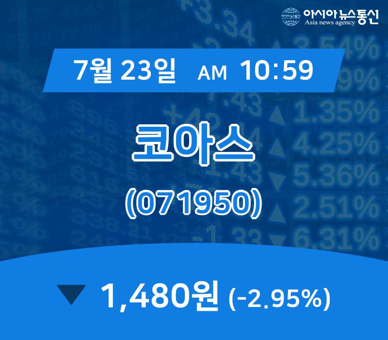 ▲7월 23일 코아스 의 주가정보 →코아스의 거래량 추세 [현시간] 코아스가(071950) 거래량 경향 코아스의 시가총액은 457억원 규모이며 상장주식수는 30,907천주 규모다. 코아스의 등락률은 전일에는 5.54%의 등락률을 보였으나 오늘은 -2.95% 변화한 1,480원을 보이고 있다. 코아스의 올해 250 최고가는 2,160원이며 250최저는 1... 2019-07-23