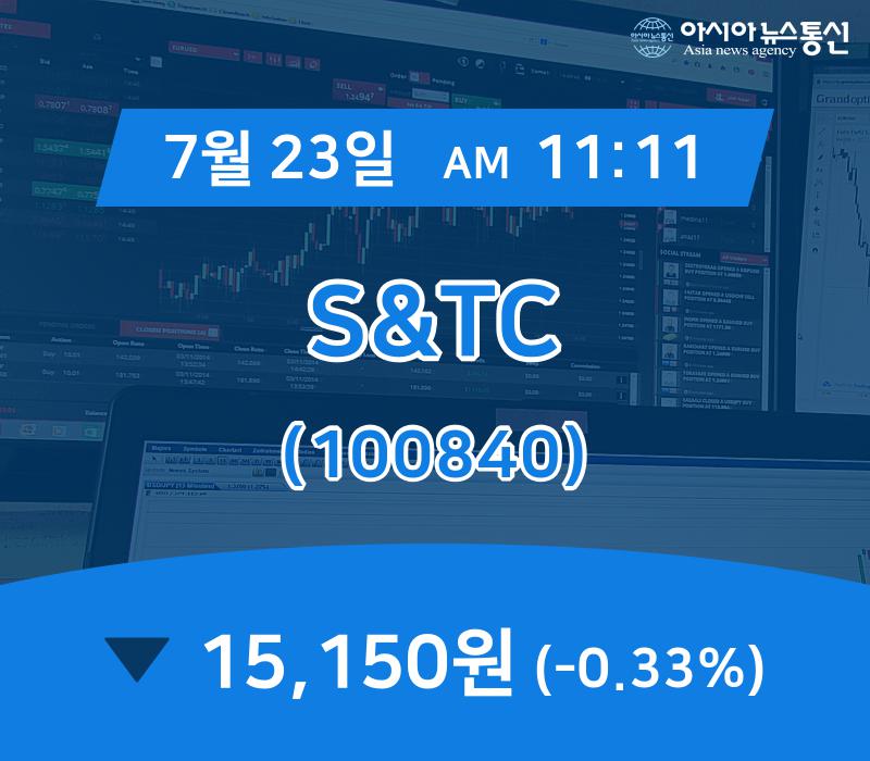 ▲7월 23일 S&TC 의 주가정보 ◈S&TC의 거래량 경향 [현시간] S&TC이(100840) 거래수량 변화 S&TC의 시가총액은 1,137억원 규모이며 상장주식수는 7,507천주 규모다. S&TC의 등락률은 전일에는 -0.33%의 등락률을 보였으나 오늘은 -0.33% 변화한 15,150원을 보이고 있다. S&TC의 올해 250 최고가는 16,450원이며 250최저는 10,400원이다. ▲S&TC... 2019-07-23