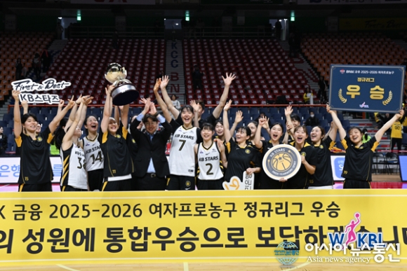 (사진출처=WKBL 공식 홈페이지) [아시아뉴스통신=이상진 기자] KB스타즈가 정규리그 우승을 차지했다. 청주 KB스타즈는 지난 30일 부산사직실내체육관에서 부산 BNK 썸과 2025-26시즌 WKBL 경기를 치렀다. KB스타즈는 1쿼터 26-14, 2쿼터 21-26, 3쿼터 26-8, 4쿼터 21-21 최종 94-69로 승리를 거뒀다. ... 2026-03-31