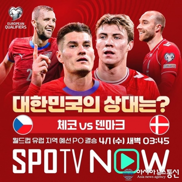 (사진제공=SPOTV) [아시아뉴스통신=이상진 기자] 대한민국 남자 축구국가대표팀의 2026 FIFA 북중미 월드컵 첫 상대가 1일 새벽 정해진다. 이번 월드컵 A조에는 대한민국과 멕시코, 남아공이 속한 가운데 UEFA 플레이오프 패스 D 승자가 합류하게 된다. 남은 한자리를 두고 FIFA 랭킹 20위 덴마크... 2026-03-31