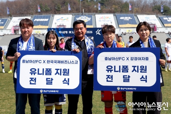 (사진제공=충남아산FC) [아시아뉴스통신=이상진 기자] 충남아산FC가 충남 지역 여자 축구 활성화를 위해 유니폼을 지원했다. 충남아산프로축구단(대표이사 이준일, 이하 충남아산FC)이 지난 28일 화성FC와의 홈경기를 앞두고 아산 지역 여자 축구부를 격려하고 응원하고자 유니폼 전달식... 2026-04-01