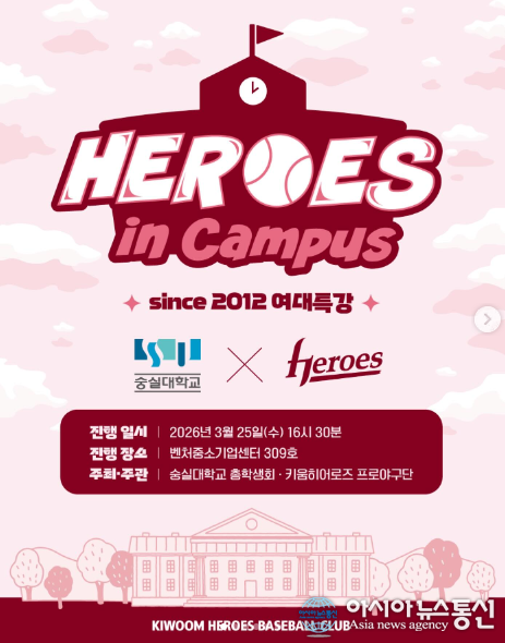 (사진제공=키움 히어로즈) [아시아뉴스통신=이상진 기자] 키움히어로즈(대표이사 위재민)는 서울특별시 소재 10개 대학교 학생들을 대상으로 야구특강 프로그램 ‘2026 HEROES in Campus’를 진행한다. 키움은 이번 특강을 통해 20대 대학생들에게 구단 소개와 야구 규칙, 응원법 등 야구... 2026-03-26