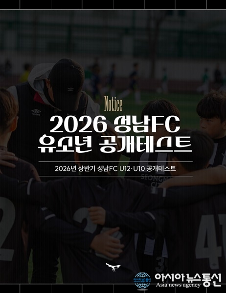 (사진제공=성남FC) [아시아뉴스통신=이상진 기자] 성남FC가 구단의 미래를 책임질 유소년 유망주 발굴에 나선다. 성남FC는 오는 4월 16일부터 ‘2026년 상반기 유소년 U12/U10 공개테스트’를 진행한다고 밝혔다. 이번 테스트는 저연령대 우수 선수를 조기에 확보하고, 공정하고 객관적... 2026-03-26