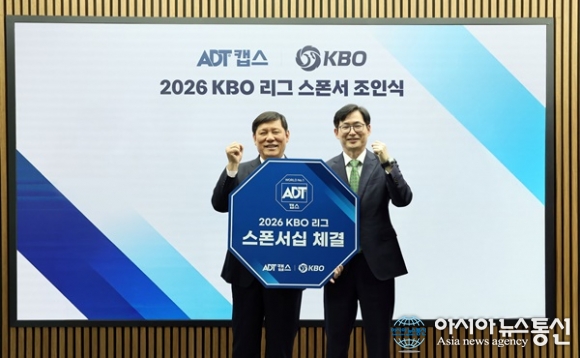 (사진제공=KBO) [아시아뉴스통신=이상진 기자] KBO와 SK쉴더스(대표 민기식)의 물리보안 브랜드 ADT캡스는 3월 24일 KBO 스튜디오에서 조인식을 갖고 2026 신한 SOL KBO 리그 공식 스폰서십을 체결했다. 국내 대표 물리보안 브랜드인 ADT캡스가 지켜온 ‘안전’의 가치를 KBO 리그에서 실점을 ... 2026-03-26