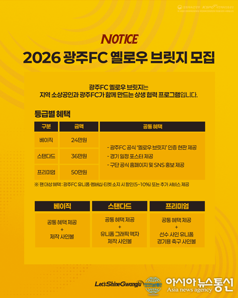 (사진제공=광주FC) [아시아뉴스통신=이상진 기자] 프로축구 광주FC가 후원의 집 ‘옐로우 브릿지(Yellow Bridge)’를 재출범하고 지역 소상공인과의 상생 행보에 나선다. 광주는 기존에 운영하던 후원의 집을 2026시즌을 맞아 리브랜딩해 구단과 지역 소상공인을 연결한다는 의미를 담은... 2026-03-26