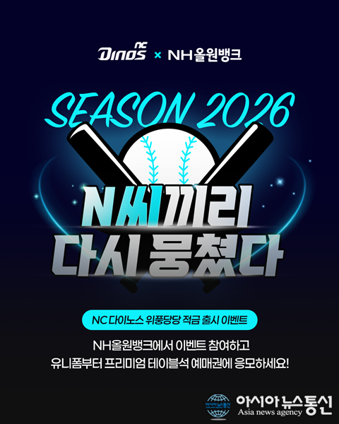 (사진제공=NC 다이노스) [아시아뉴스통신=이상진 기자] NC 다이노스가 메인스폰서인 NH농협은행과 함께 2026시즌 개막을 맞아 팬 참여형 금융상품 ‘NC 다이노스 위풍당당 적금’을 출시했다. 해당 적금은 팬들의 응원과 참여가 실질적인 혜택으로 이어질 수 있도록 기획된 것이 특징... 2026-03-26