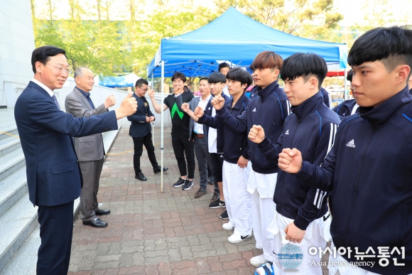 20일 박정준 산청군수 권한대행이 산청군을 대표한 도민체전 태권도 사전경기 참가 선수들을 격려하고 파이팅을 하고 있다.(사진제공=산청군청) 산청군이 ‘제57회 경남도민체육대회’ 사전경기 태권도 대회 참가를 시작으로 본격적인 메달 수확에 나선다. 산청군체육회는 20일부터... 2018-04-21