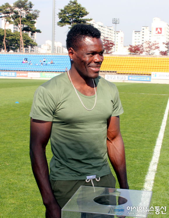 카메룬 출신 '난민복서' 길태산이 21일 천안축구센터에서 열린 2018 내셔널리그 천안시청과 대전코레일의 경기에서 '특별 경품추첨자'로 나와 추첨을 하고 있다./아시아뉴스통신=최영민 기자 ‘난민출신 복서’ 길태산(본명 에뚜빌?카메룬?31)이 자유를 찾아 온 대한민국에... 2018-04-21