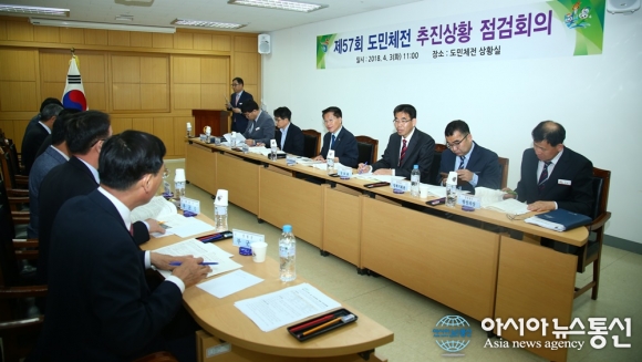 도민체육대회 준비상황 점검회의.(사진제공=경상남도) 경상남도가 안전하고 성공적인 도민체육대회 개최를 위해 한경호 도지사 권한대행을 비롯한 경상남도체육회, 분산개최 7개 시?군 관계자 등이 참석한 가운데 도민체전 점검회의를 3일 진주종합경기장 내 도민체전상황실에서 개최했다... 2018-04-03