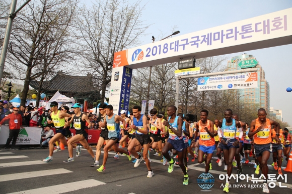 1일 오전 대구 국채보상운동기념공원 앞에서 '2018 대구국제마라톤대회'에 참가한 엘리트 선수들이 출발하고 있다.(사진제공=대구시청) '2018 대구국제마라톤대회'가 1일 오전 국채보상운동기념공원을 중심으로 한 대구시내 일원에서 1만5000여명의 마스터즈 참가 선수들과 12개국 1... 2018-04-01