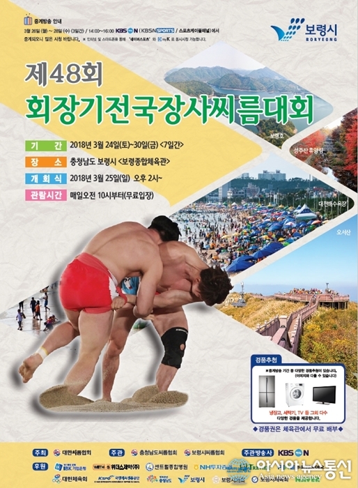 제48회 회장기 전국장사씨름대회 포스터.(사진제공= 보령시청) 충남 보령에서 전국 장사씨름대회가 열린다. 보령시는 오는 24일부터 30일까지 보령종합체육관에서 제48회 회장기 전국장사씨름대회를 개최한다고 21일 밝혔다. 대한씨름협회가 주최하고 충청남도씨름협회와 보령시 씨름... 2018-03-21