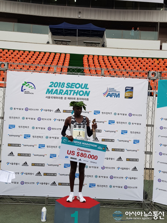 청양군체육회 소속 윌슨 로야나에 에루페(30.케나)가 18일 열린 2018 서울국제마라톤대회에서 우승을 차지하고 시상대에 올랐다. 에루페는 세계 정상급 선수들과 치열한 레이스를 펼친 결과 2시간 7분16초로 결승점을 통과해 이 대회에서 4번째 우승을 차지했다./(사진=청양군청) 2018-03-18