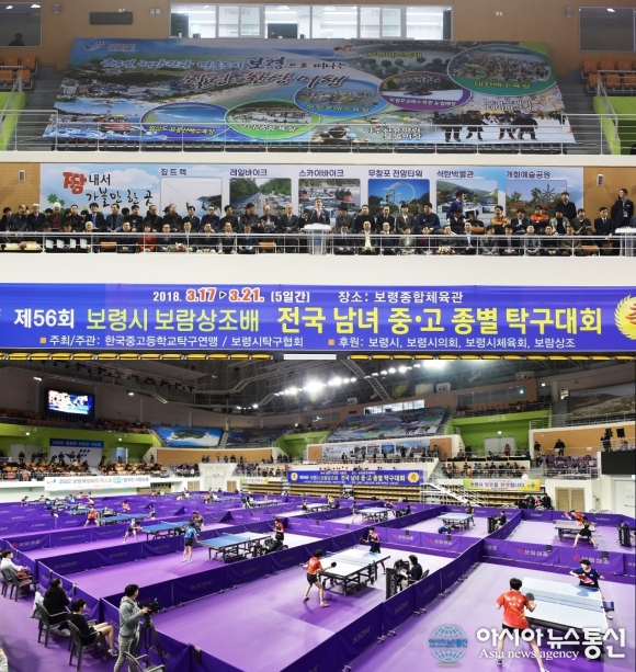 17일 개막된 제56회 보람상조배 전국 남녀 중·고종별 탁구대회가 1100여 명의 선수와 임원 등이 참여한 가운데 오는 21일까지 충남 보령시 보령종합체육관에서 펼쳐진다.(사진제공= 보령시청) 제56회 보람상조배 전국 남녀 중·고종별 탁구대회가 충남 보령시 보령종합체육관에서 17일... 2018-03-18