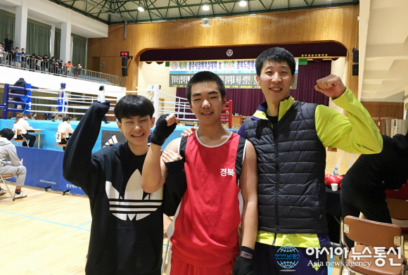 경북 봉화중학교 김재민 학생(가운데)이 지난 16일부터 18일까지 사흘간 경주공업고등학교에서 열린 '2018 경북소년체육대회' 복싱 라이트웰트급 결승전에서 우승한 후 기념촬영을 하고 있다.(사진제공=봉화교육청) 경북 봉화의 작은학교 소년이 경북소년체전 복싱 라이트웰터급에서 ... 2018-03-19