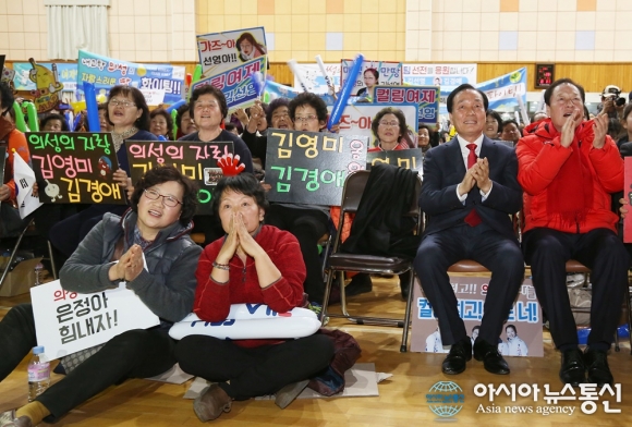 23일 오후 강원 강릉컬링센터에서 열린 2018평창동계올림픽 여자 컬링 준결승전 경기를 김주수 의성군수가 주민들과 함께 의성여고 체육관에서 지켜보며 단체 응원을 하고 있다. 이날 대한민국과 일본의 경기는 연장 승부끝에 8-7 한국이 승리했다./아시아뉴스통시=김철... 2018-02-23