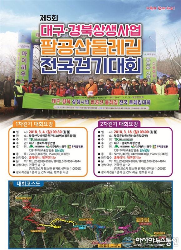 '제5회 대구·경북 상생사업 팔공산 둘레길 전국 걷기 대회' 포스터.(자료제공=대구시청) '제5회 대구·경북 상생사업 팔공산 둘레길 전국 걷기대회'가 오는 3월4일과 18일 2차례에 걸쳐 개최된다. 3월4일에 개최되는 1차 대회는 참가자의 체력과 집결지를 고려해 7㎞, 15㎞... 2018-02-24