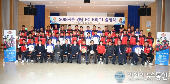 경남FC 출정식.(사진제공=경상남도) 경남FC는 22일 오전 11시 도청 대회의실에서 ‘2018시즌 경남FC 출정식’을 가지고 승리를 위한 비장의 각오를 다졌다. 이날 출정식에는 구단주인 한경호 경상남도지사 권한대행과 김종부 감독을 포함한 선수단 50여 명이 참석했다. 한경호 구단... 2018-02-22