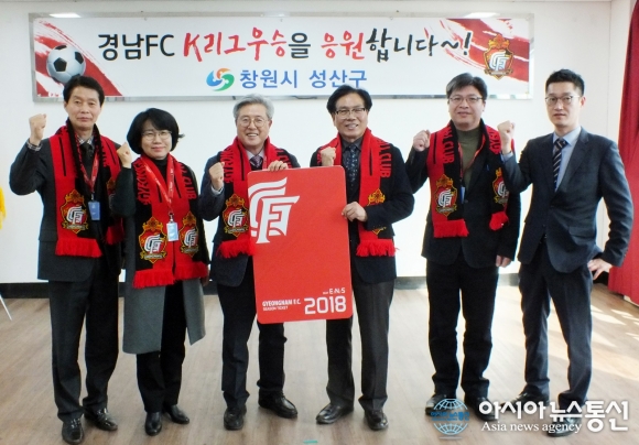 22일 양윤호 성산구청장이 경남FC 홈 시즌권 구매에 동참하며, 조기호 경남FC 대표이사 등과 기념촬영을 하고 있다.(사진제공=창원시청) 경남 창원시 양윤호 성산구청장은 22일 경남FC 홈 시즌권 구매에 동참하며, 조기호 경남FC 대표이사에게 K리그 클래식 입성을 축하했다. 경남FC 홈 시즌권... 2018-02-22