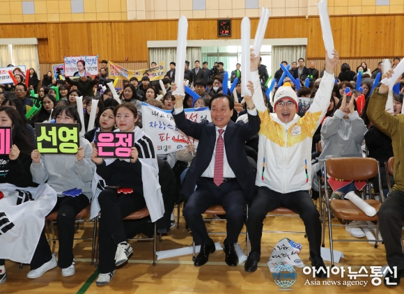2018평창동계올림픽 여자 컬링 예선전 대한민국-미국 경기가 열린 20일 오후 김주수 의성군수(오른쪽 두번째)가 경북 의성여고 강당에서 열린 응원전에서 주민 및 재학생들과 함께 대한민국 대표팀이 미국을 물리치고 4강에 진출하자 환호하고 있다.(사진제공=의성군청) 2018평창 동계올림픽 ... 2018-02-21