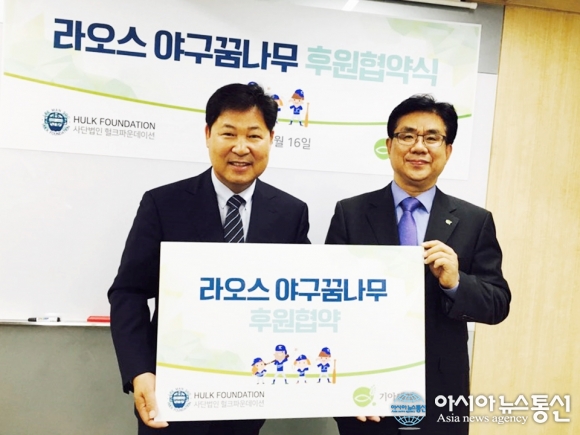 16일 이만수 전 SK 와이번스 감독(왼쪽)이 이사장으로 있는 헐크파운데이션이 국제구호단체 기아대책(회장 유원식)과 라오스 야구발전을 위한 MOU를 체결했다.(사진제공=헐크파운데이션) 이만수 전 SK 와이번스 감독이 이사장으로 있는 헐크파운데이션이 16일 국제구호단체 기아대책(회장 유... 2017-05-19