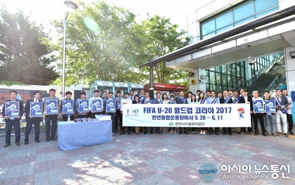 천안시설관리공단 월드컵 성공개최 홍보지원 모습.(사진제공=천안시청) 충남 천안시 시설관리공단(이사장 김동규, 이하 공단)은 19일 천안역 동부·서부광장 일원에서 ‘FIFA U-20 월드컵 코리아 2017’ 성공적인 개최를 위한 홍보행사를 진행했다. 오는 20일 U-20월드컵의 개막을 앞... 2017-05-19