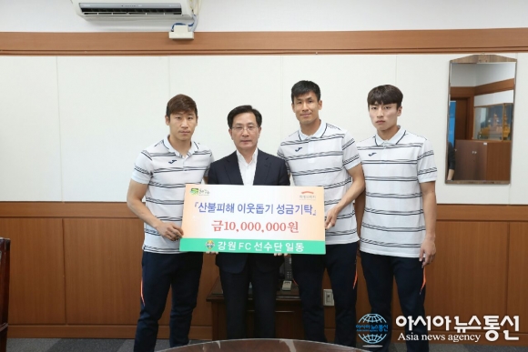18일 강원FC 이근호, 정조국, 박요한이 강릉시청을 방문해 최명희 시장에게 강릉산불 이재민을 위해 써 달라면 성금 1000만원을 전달하고 기념 사진을 찍고 있다.(사진제공=인제군청) 강원FC 선수단이 강릉 산불 피해 지역을 위해 1000만원을 기탁했다. 강원FC 선수단을 대표해 이근호, 정조국,... 2017-05-19