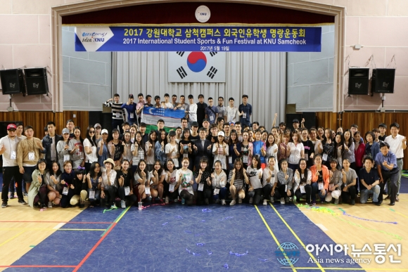 19일 강원대학교(총장 김헌영)는 삼척캠퍼스 교내 체육관에서 외국인유학생 135명과 함께 체육행사를 개최하고 기념 사진을 찍고 있다.(사진제공=강원대학교) 강원대학교(총장 김헌영)는 19일 삼척캠퍼스 교내 체육관에서 외국인유학생 135명과 함께 체육행사를 개최했다고 밝혔다. 이번 행... 2017-05-19