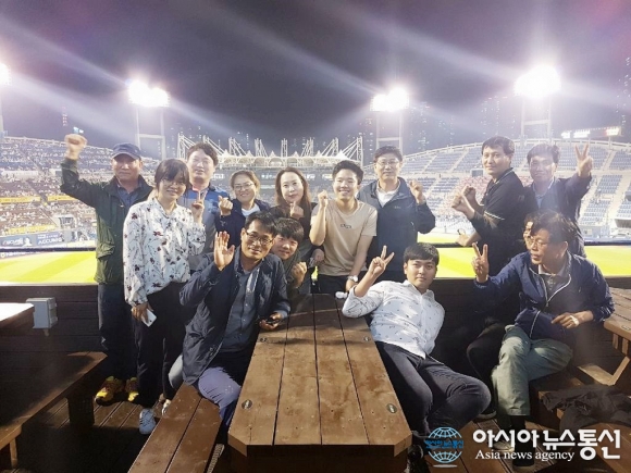 19일 마산합포구 안전건설과 직원들이 NC다이노스 응원에 앞서 함께 사진촬영을 하고 있다.(사진제공=창원시청) 경남 창원시 마산합포구(구청장 강호동)는 19일 저녁 마산야구장에서 프로야구 창원시 연고인 NC를 응원했다. 마산합포구는 간부회의 시 부서별 MT를 야구장을 찾아 NC를 응원하... 2017-05-20