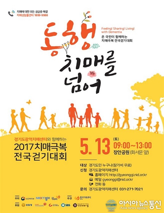 이번 대회는 치매 환자와 가족, 치매 파트너, 일반인, 자원봉사자 등 약1500여명이 참가한다.(사진제공=경기도청) 치매 환자와 가족들에게 응원의 목소리를 전하기 위해 온 국민이 함께 하는 걷기대회 '동행, 치매를 넘어'가 개최된다. 경기도는 경기도광역치매센터와 함께 오는 13일 9... 2017-05-11