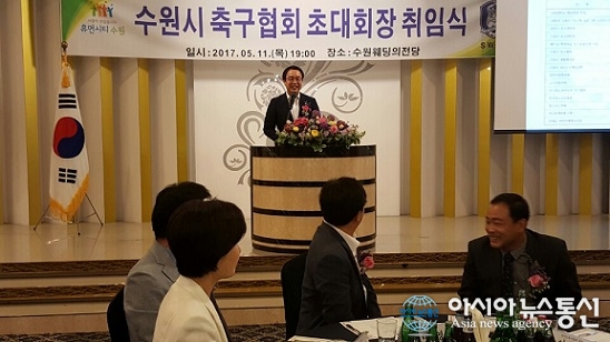 경기도의회 정기열 의장(더민주. 안양4)은 11일 오후 수원 웨딩의 전당에서 열린 수원시 축구협회장 취임식에 참석했다. 정 의장은 수원시 통합축구협회장에 취임한 이순우 초대회장에게 축하를 전하며, 생활체육과 엘리트 체육의 통합 발전을 위해 노력해 달라 당부했다.(사진제공=경기도의회) ... 2017-05-12