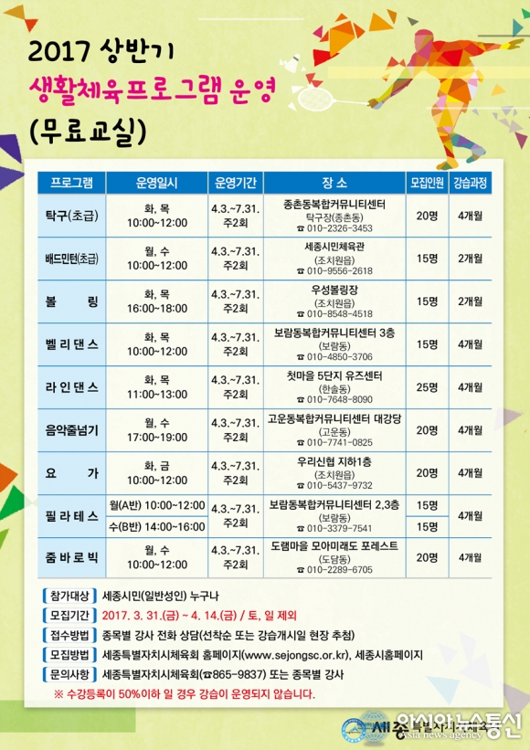 세종시체육회가 3일부터 운영하는 올해 상반기 생활체육 프로그램 홍보 포스터.(사진출처=SNS) 세종시체육회가 3일부터 올해 상반기 생활체육 프로그램을 운영한다. 탁구 배드민턴 볼링 밸리댄스 등 9개 종목에 걸쳐 각 종목당 15~20명씩 모집해 주 2회 2~4개월간 운영할 예정이다. 세종시... 2017-04-03