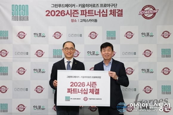(사진제공=키움 히어로즈) [아시아뉴스통신=이상진 기자] 키움히어로즈(대표이사 위재민)는 23일 건강기능 식품 브랜드 ‘그린푸드메이커’와 2026시즌 파트너십 계약을 체결했다. 키움은 고척스카이돔 홈플레이트 후면 LED에 광고 권리를 제공하고, 그린푸드메이커는 이에 따른 후... 2026-03-24