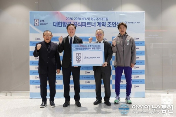 (사진제공=대한축구협회) [아시아뉴스통신=이상진 기자] 대한축구협회가 대한항공과 손을 잡고 대한민국 축구 국가대표팀의 비상을 지원한다. KFA는 23일 인천국제공항 제2여객터미널에서 대한항공과 공식 파트너십 협약식을 개최했다. 이날 협약식에는 KFA 이용수 부회장, 북중미 월드컵... 2026-03-24