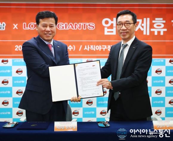 롯데자이언츠 김창락 대표와 최원일 한국마사회 렛츠런파크 부산경남본부장이 15일 업무제휴 협약식을 개최하고 기념촬영을 하고 있다.(사진제공=롯데자이언츠) 프로야구 롯데자이언츠(대표이사 김창락)는 한국마사회 렛츠런파크 부산경남(본부장 최원일)과 15일 ‘제 29회 렛츠런파크 ... 2017-03-16